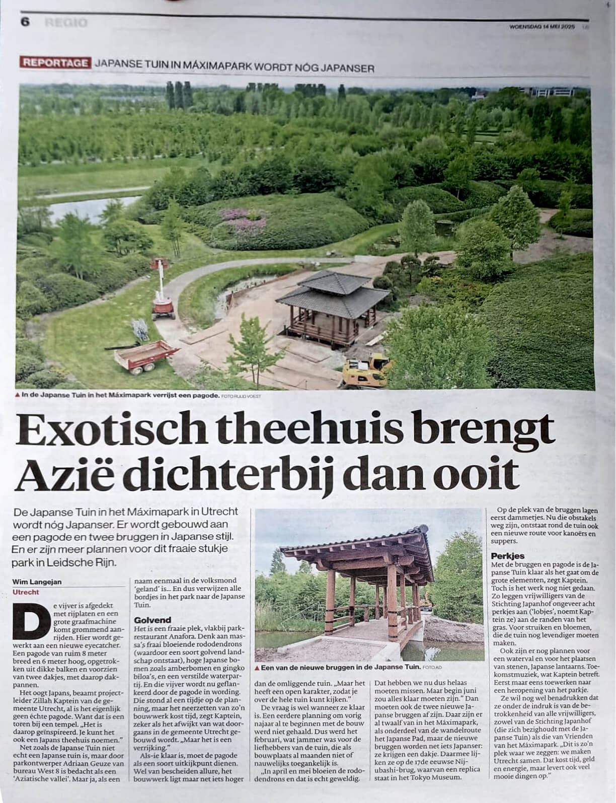 In het Algemeen Dagblad verscheen 14 mei een artikel over de Japanse tuin van het Máximapark. Hierin recente foto’s van de nieuwe bouwwerken: het paviljoen en een van de twee bruggen. Lees het zelf: